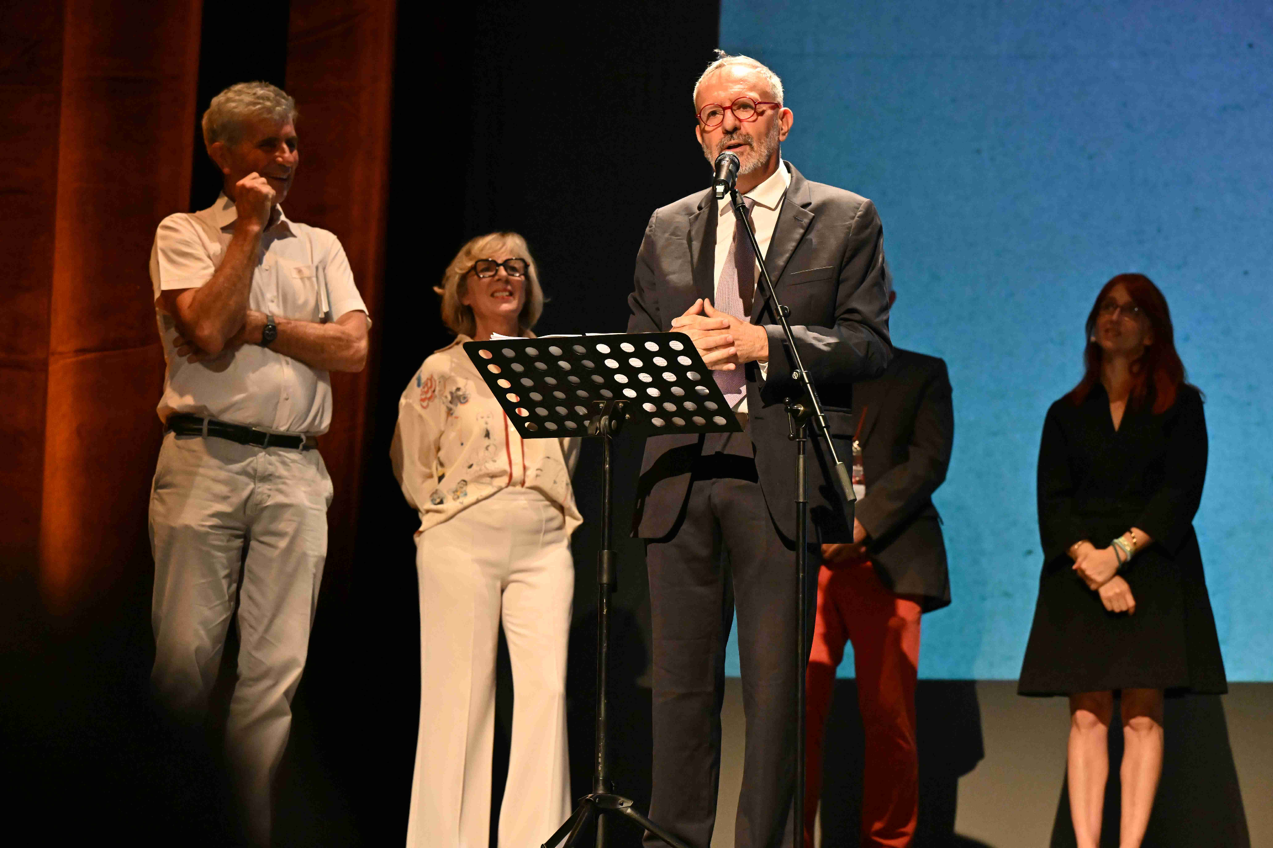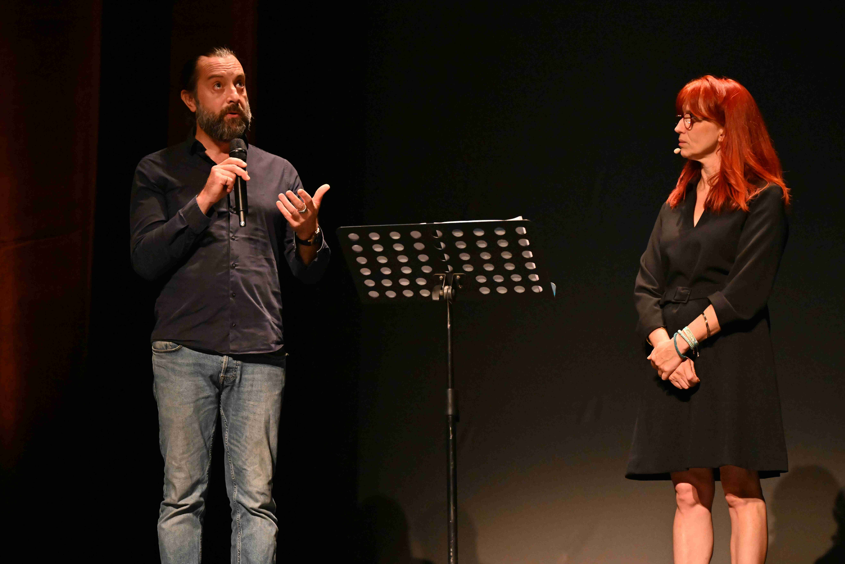 Retour sur la soirée... Après le discours d’accueil de Monsieur le Maire et de Madame l’Ajointe à la Culture, l'intervention de Jean-Luc Ducousso, Président des Amis du Théâtre, c'est au tour de M. Bruno Delaroche (facétieux Jérôme Rouger, de la compagnie La Martingale), Conseiller en charge des expérimentations au ministère de la Culture, de prendre la parole pour un vrai-faux discours joyeusement décalé et hilarant. Puis, place à la présentation de la programmation par notre directrice, Stéphanie Waldt avec l'intervention également de Matthieu Léonard (Le Faiseur d'ombres), Julien Dubuc (Les Aveugles), Victoire Berger-Perrin (Trésor National) et Arnaud Aldigé (Il n'y a pas de Ajar).